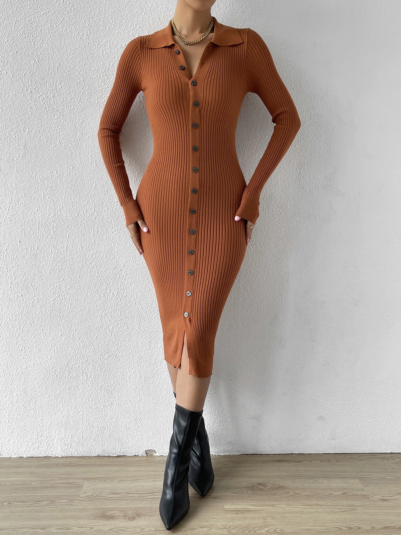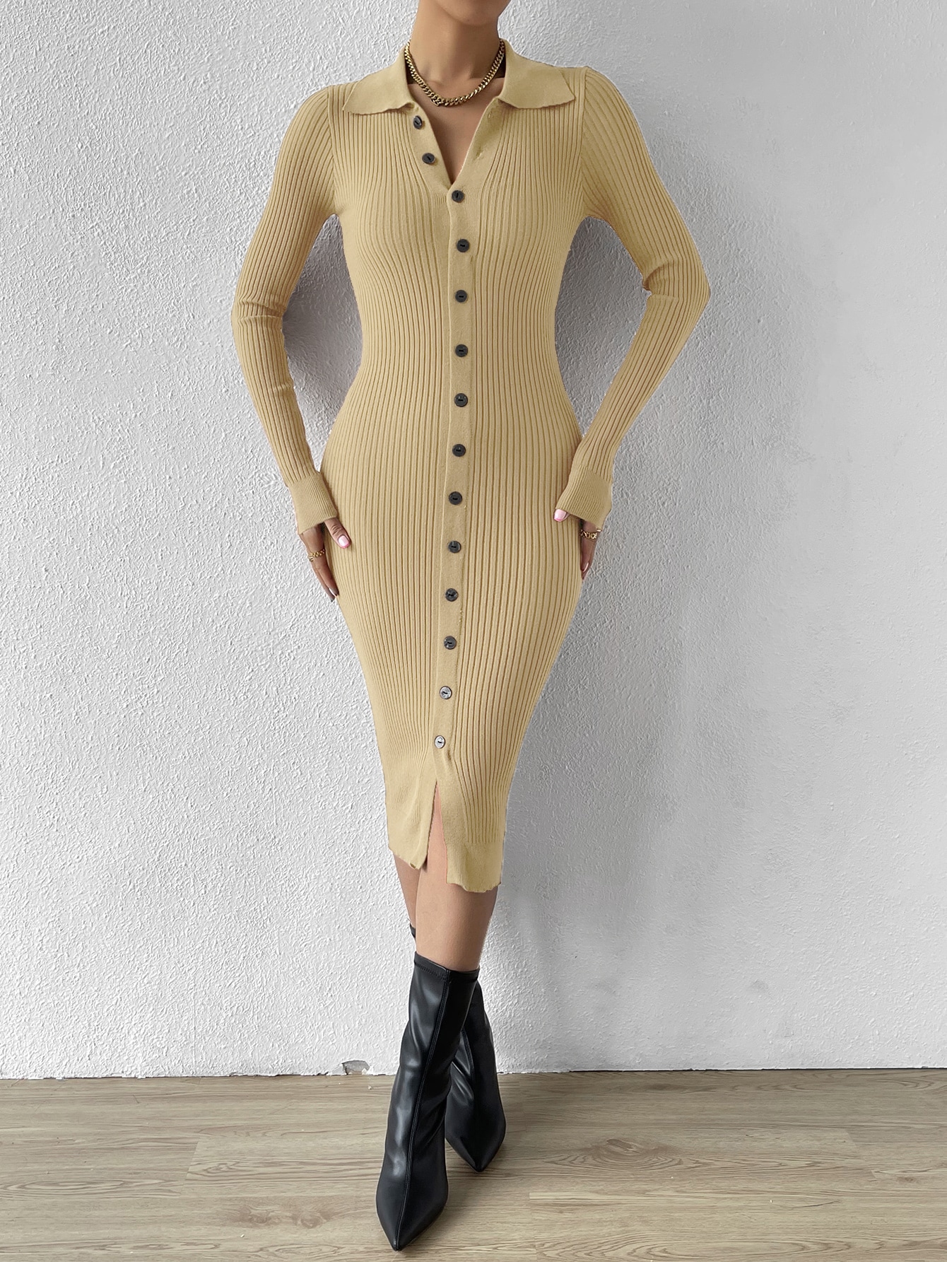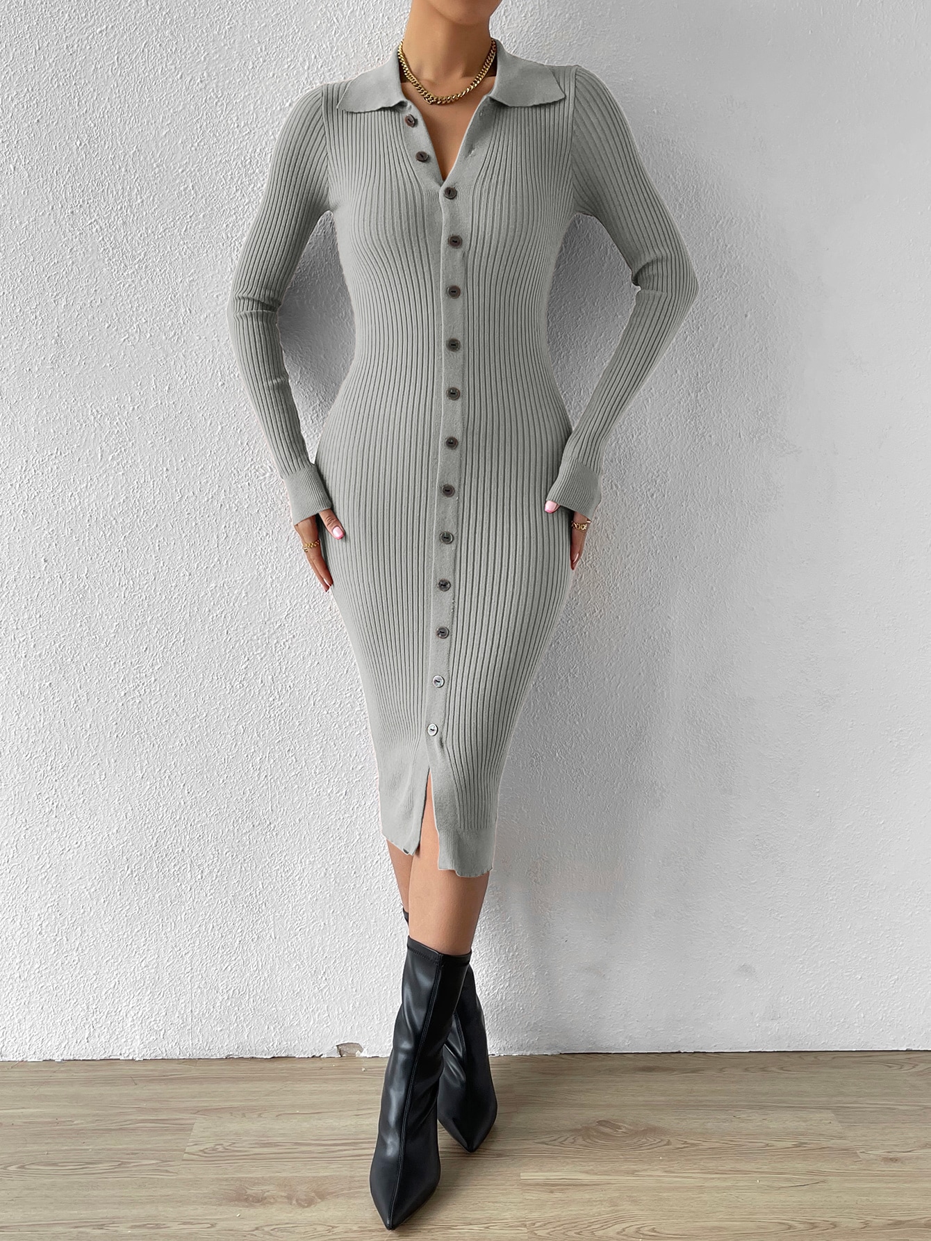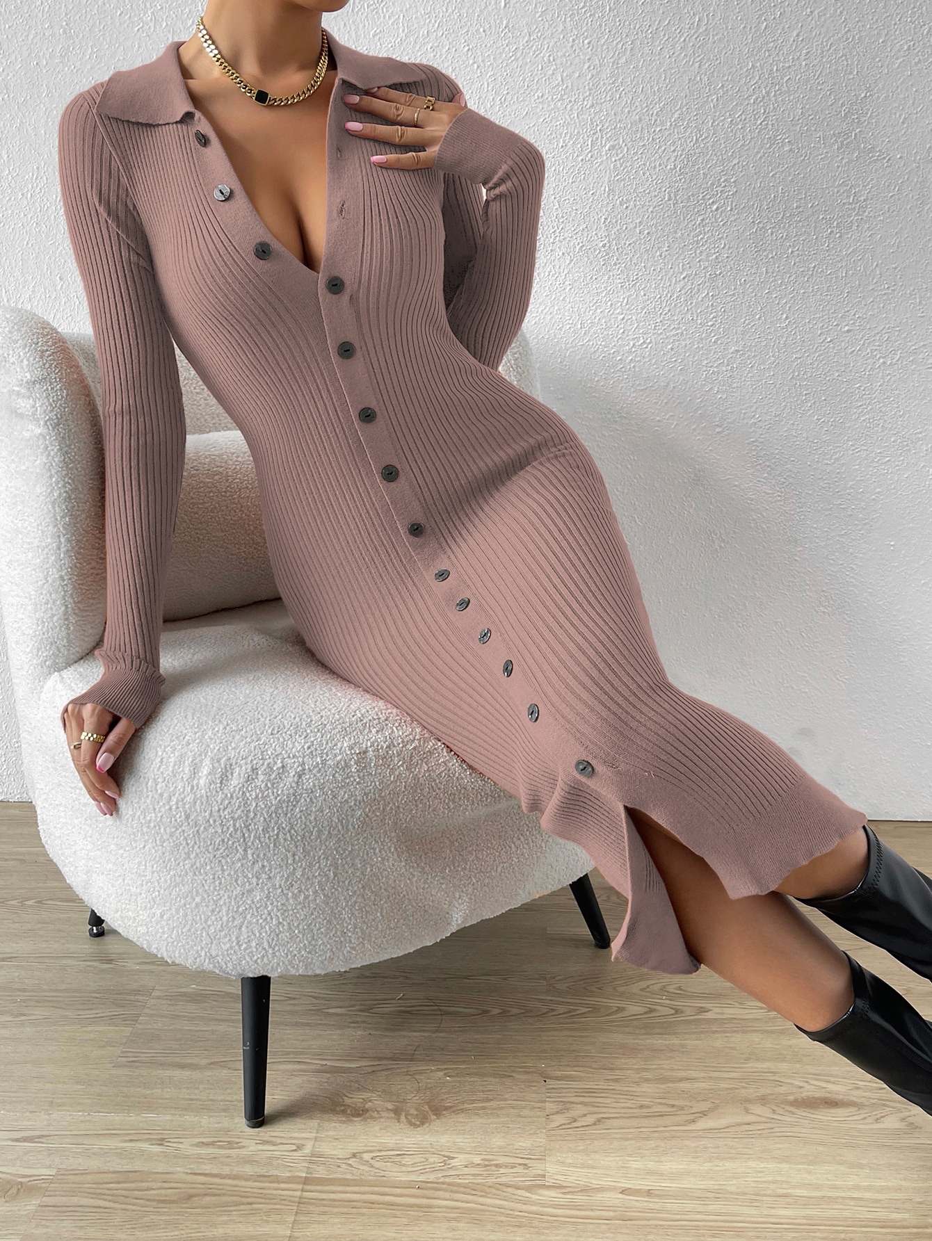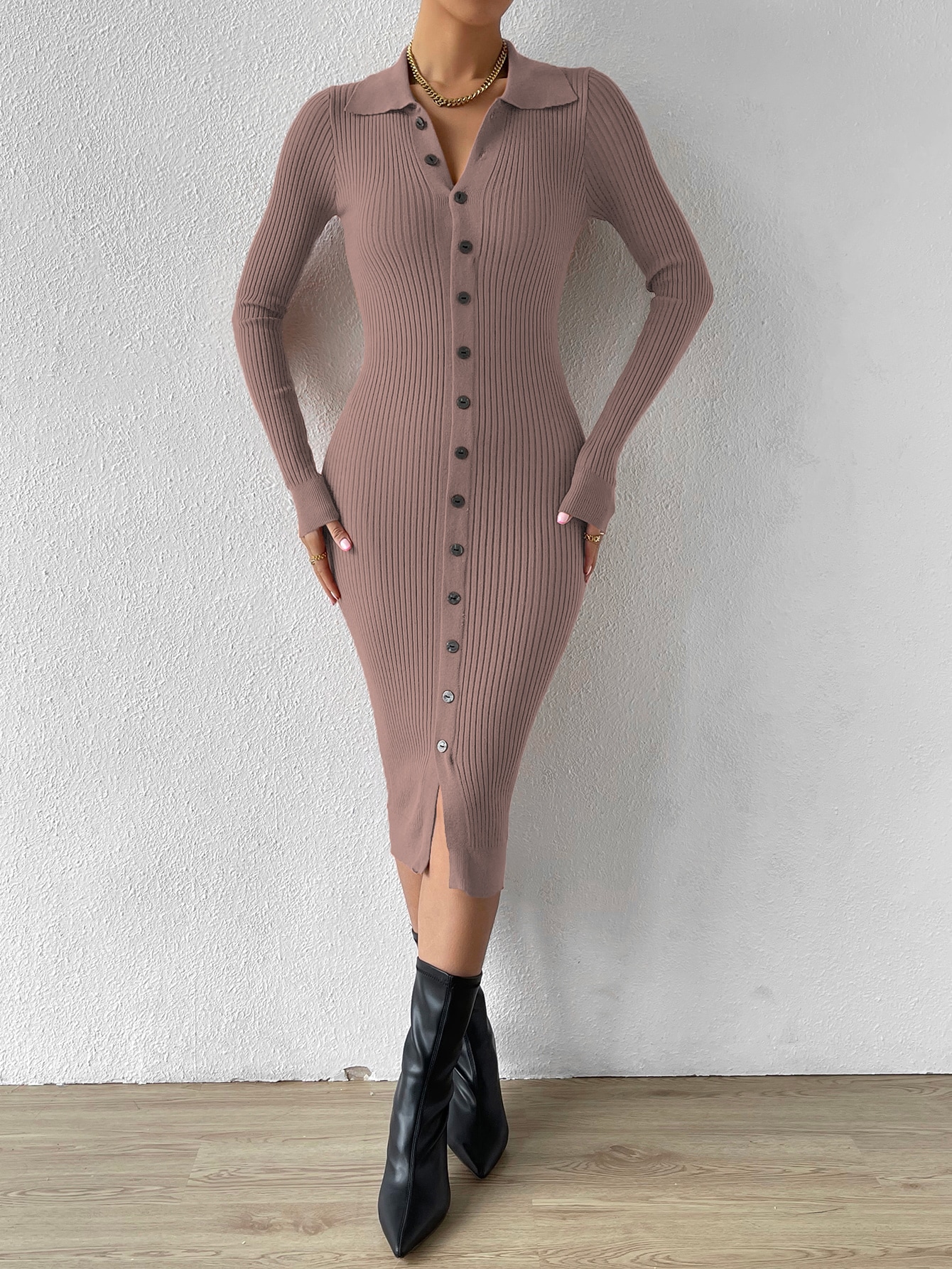 Button Through Ribbed Knit Sweater Dress