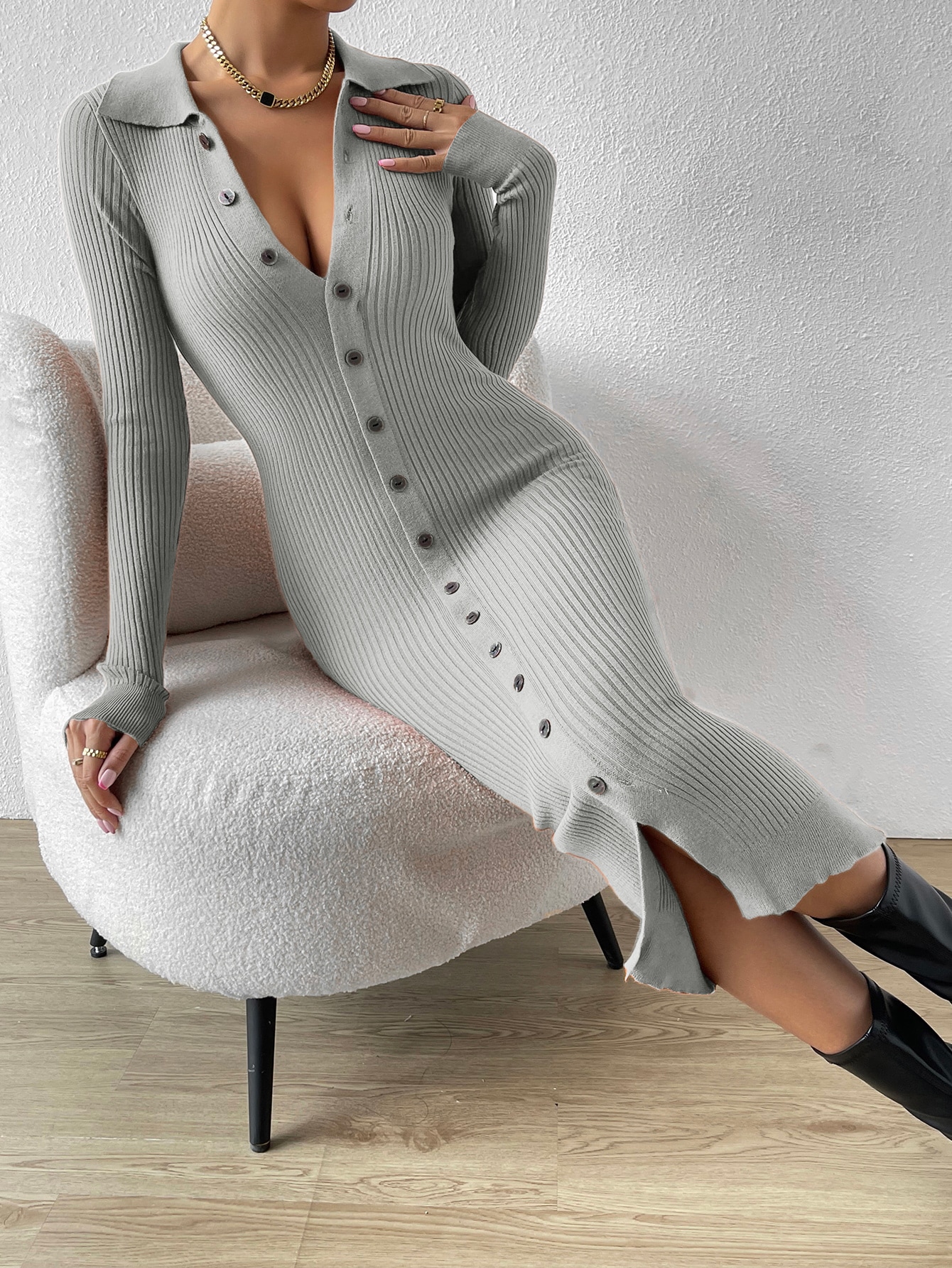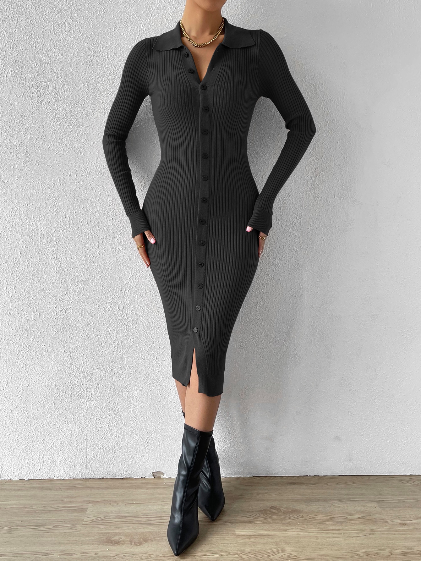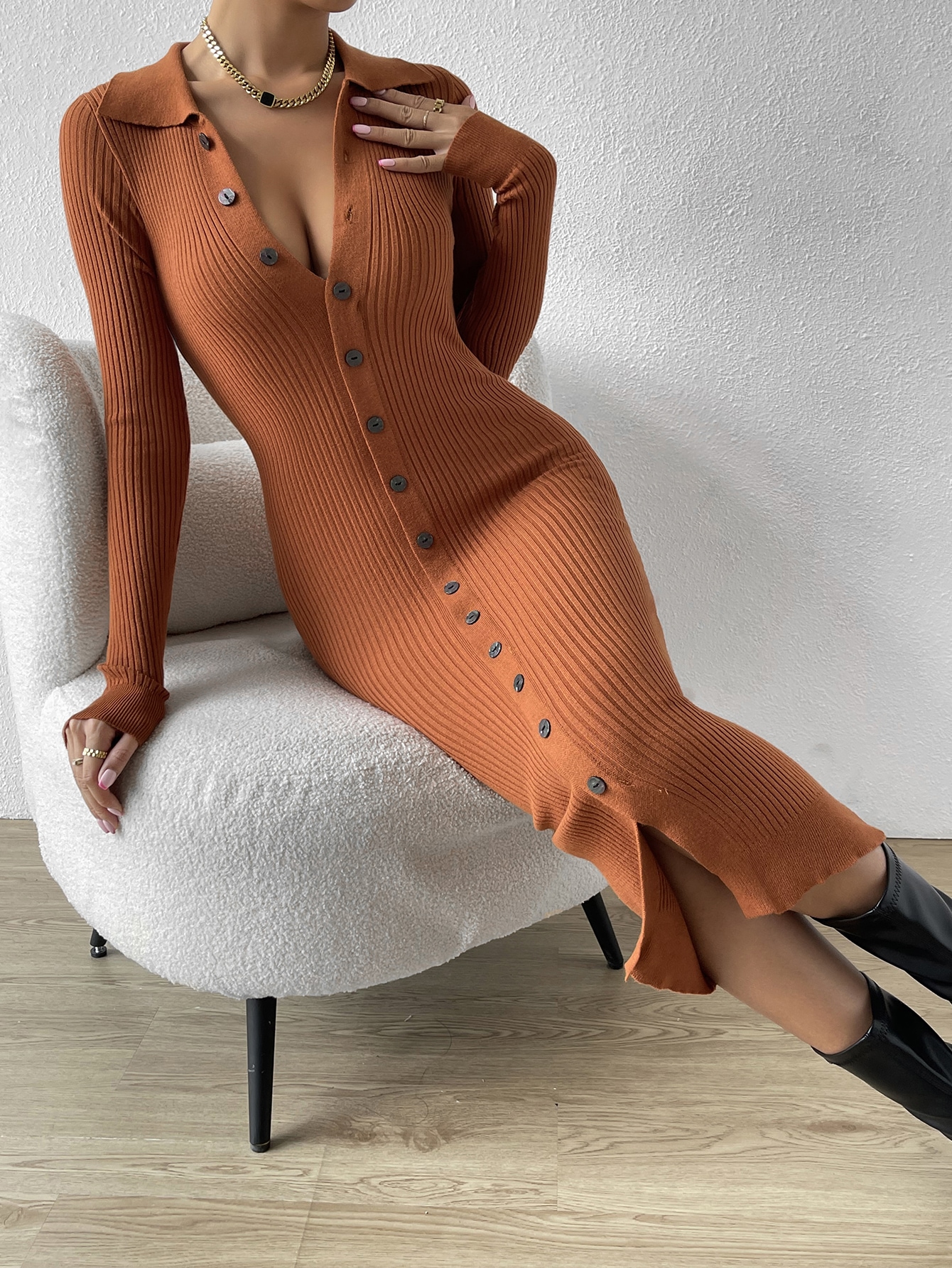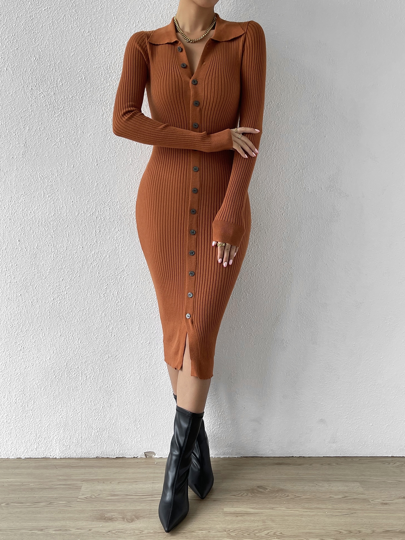 Button Through Ribbed Knit Sweater Dress